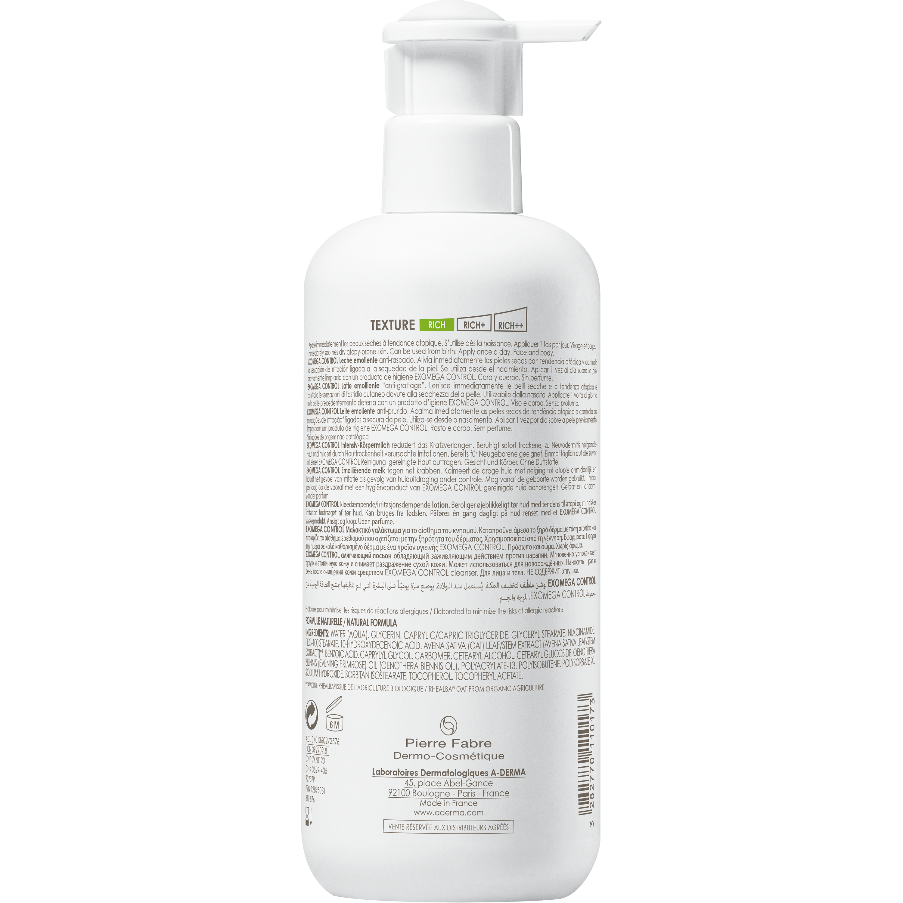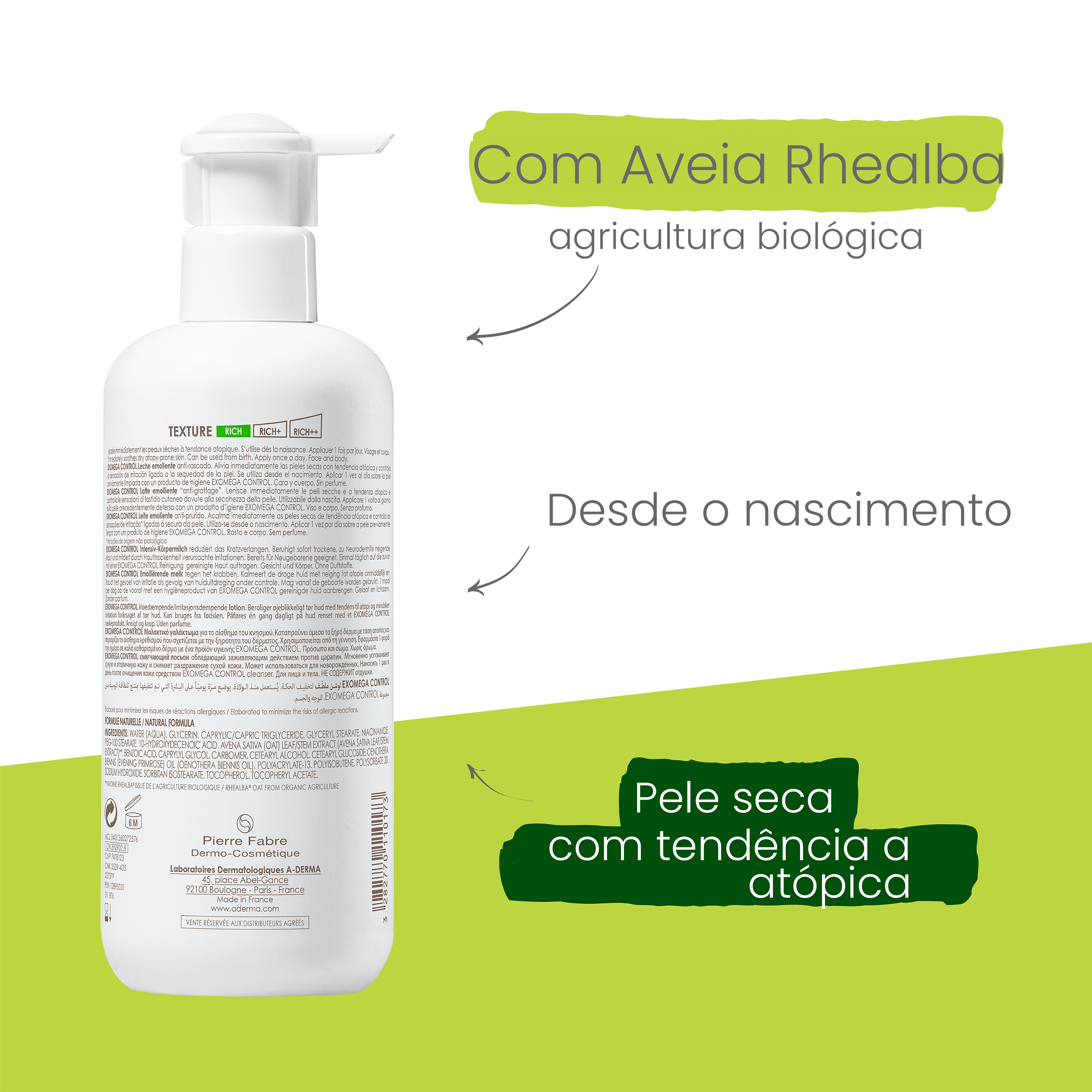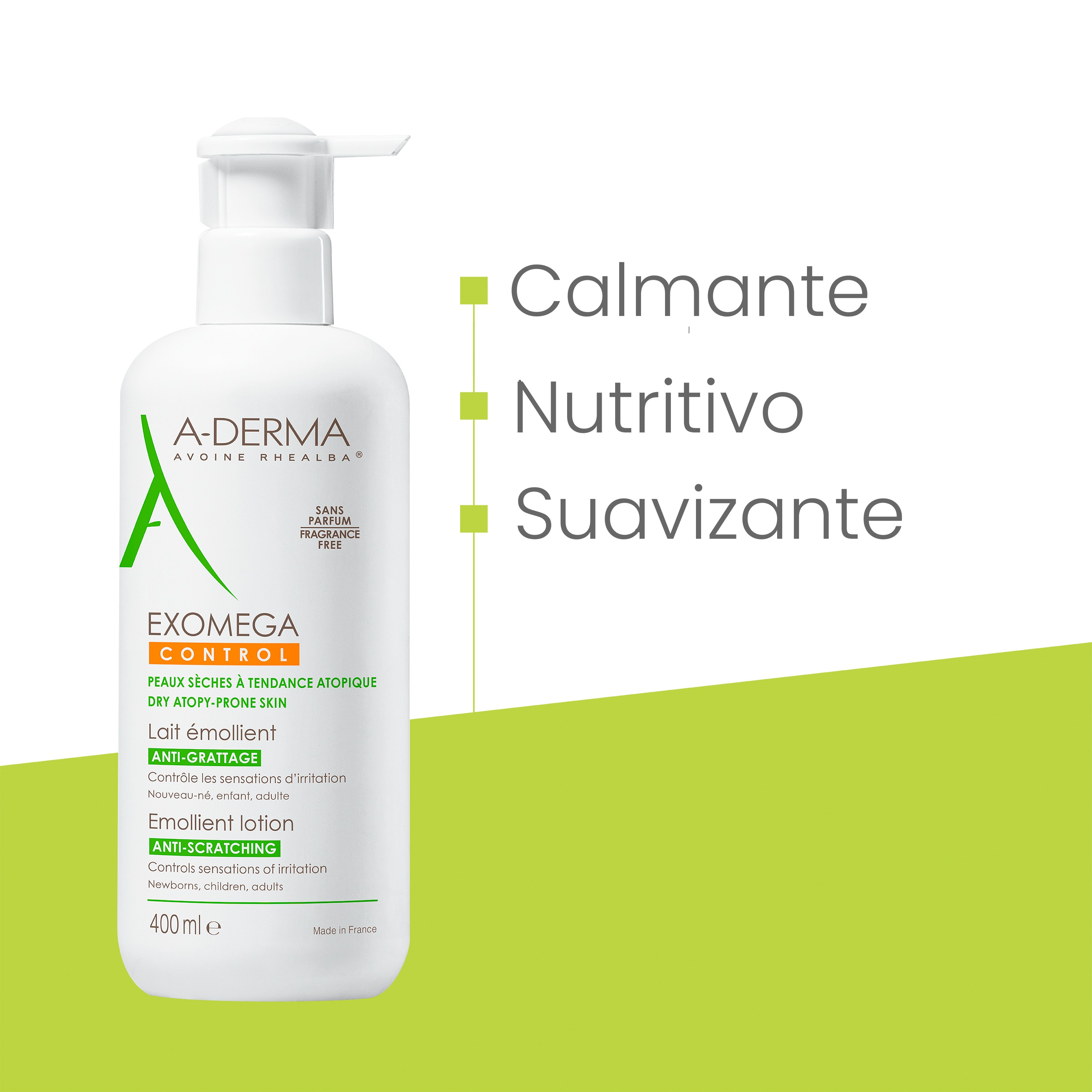 A-Derma Exomega Control Leite Emoliente é um cuidado hidratante que acalma e reduz o desconforto, irritação, secura e prurido na pele seca de tendência a eczema atópico.