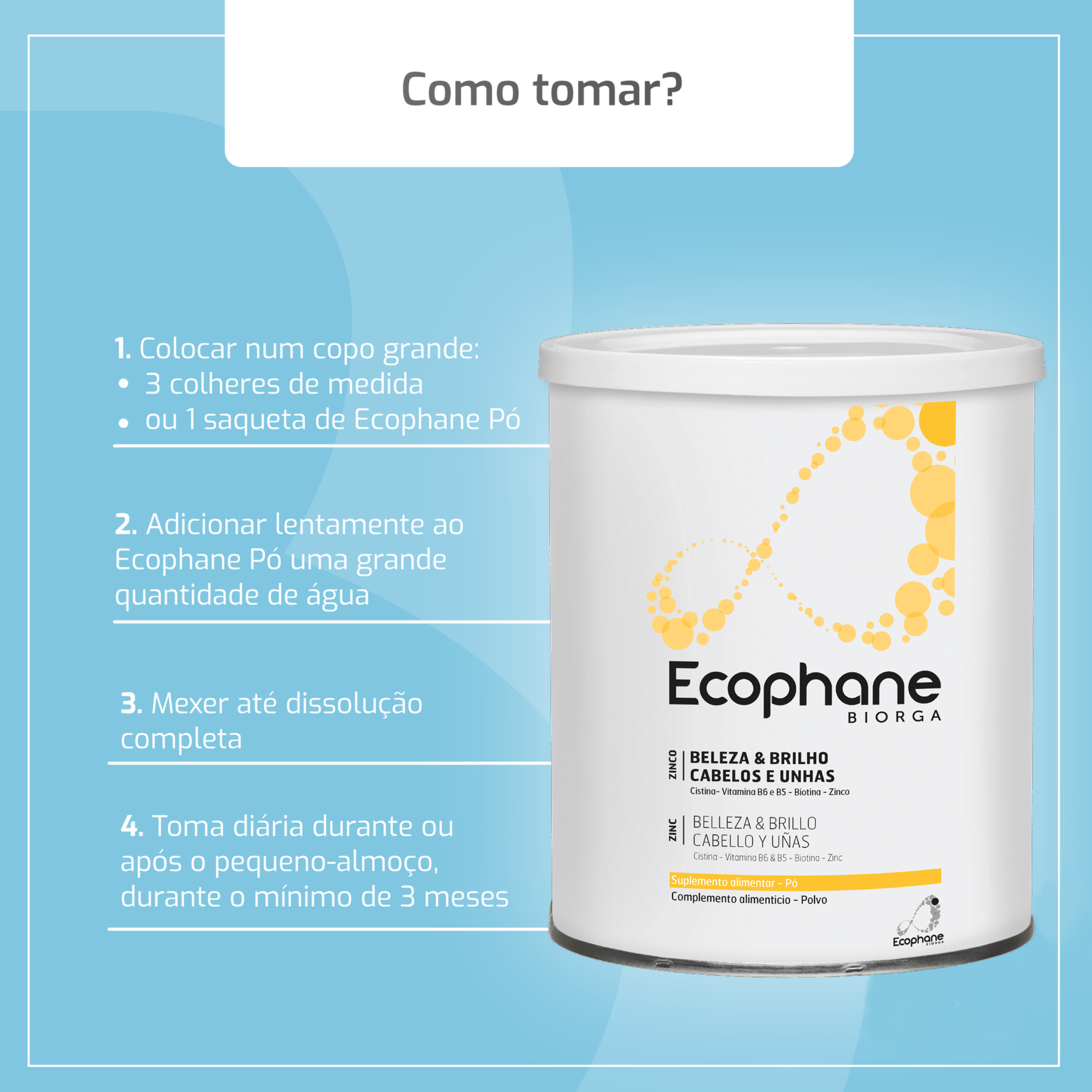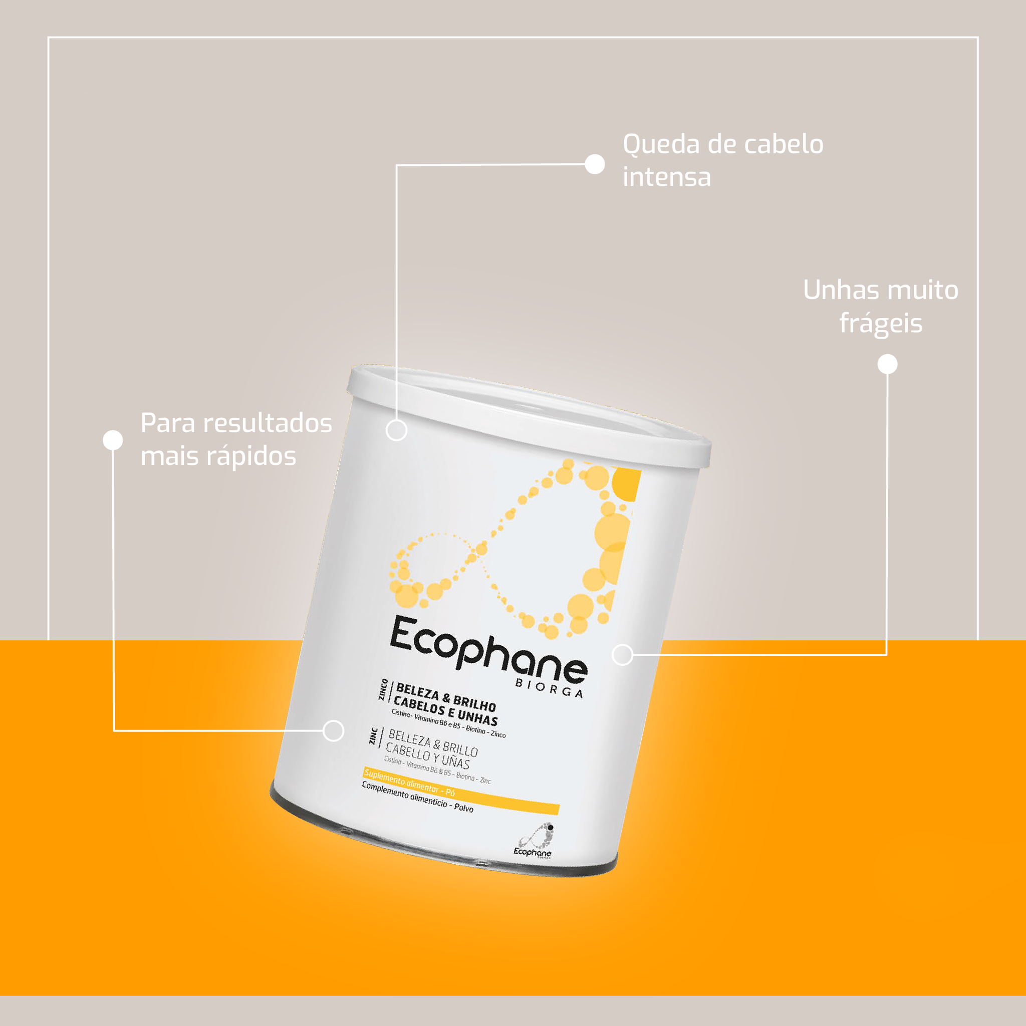 Ecophane Pó é um suplemento alimentar indicado na queda capilar e fortalecimento de cabelo e unhas.