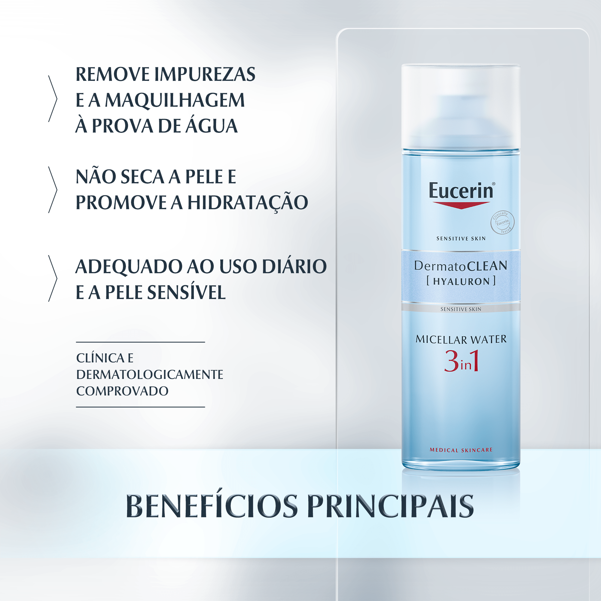 Eucerin DermatoCLEAN Solução de Limpeza Micelar 3 em 1 tem tripla ação: limpa, desmaquilha e hidrata.