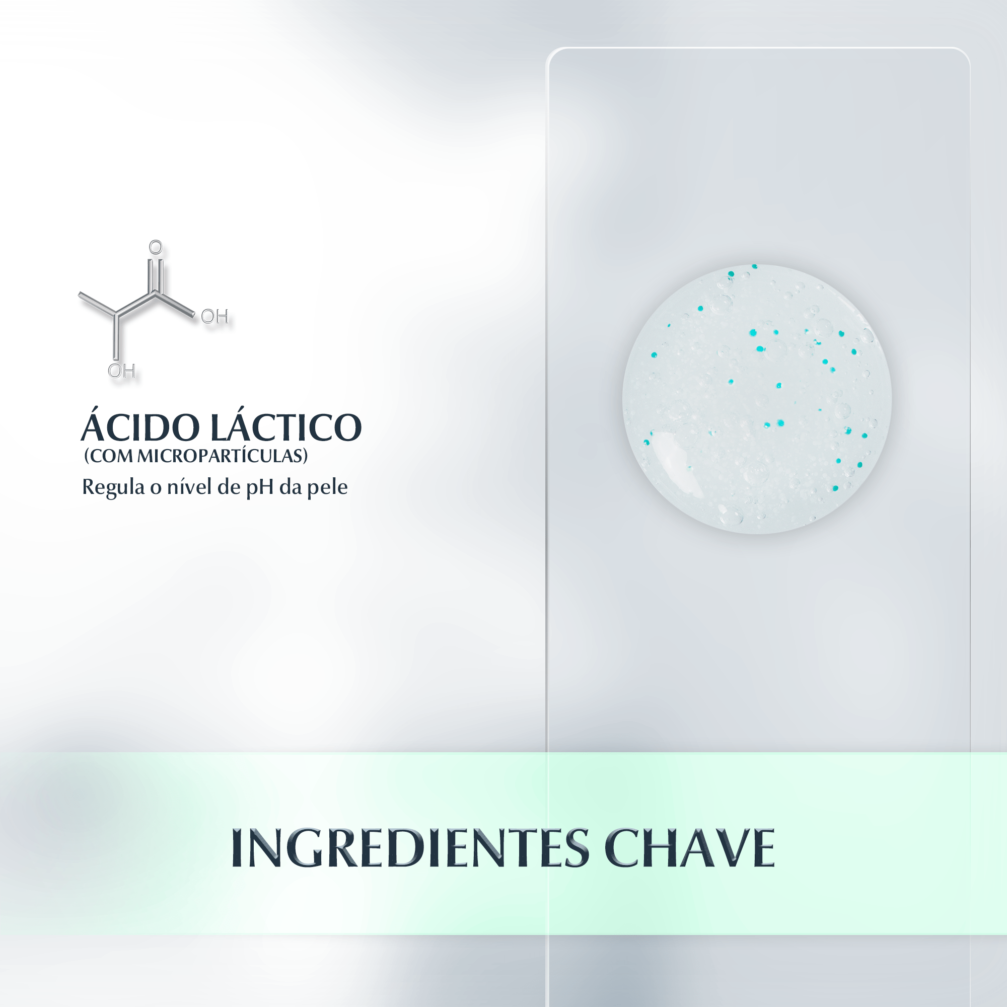 A fórmula exfoliante sem óleo e com Ácido Láctico e Micro-Partículas naturais elimina as impurezas, desobstrui os poros e uniformiza a textura da pele. Ao mesmo tempo que reduz os comedões abertos (pontos negros) e imperfeições ao eliminar as células mortas da pele.
